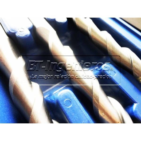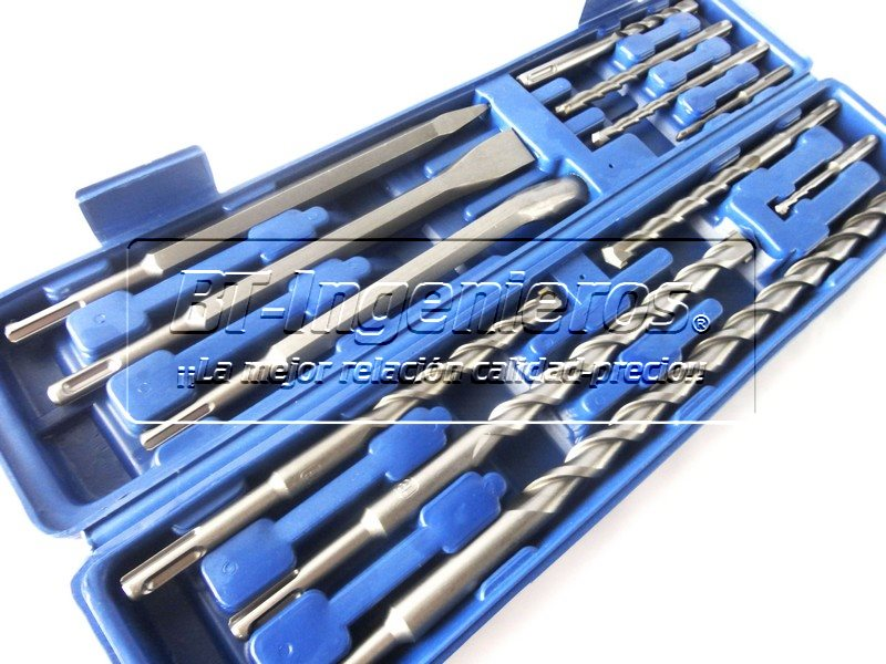 El juego incluye brocas de diferentes tamaños: 5,5, 6 x 110 mm; 8, 10 y 12 x 160 mm; 14, 16 x 210 mm; 18 x 300 mm y 20 x 450 mm. Además, cuenta con tres cinceles: punta, plano y acanalado. Todas las piezas se conectan a través de mandriles SDS+.