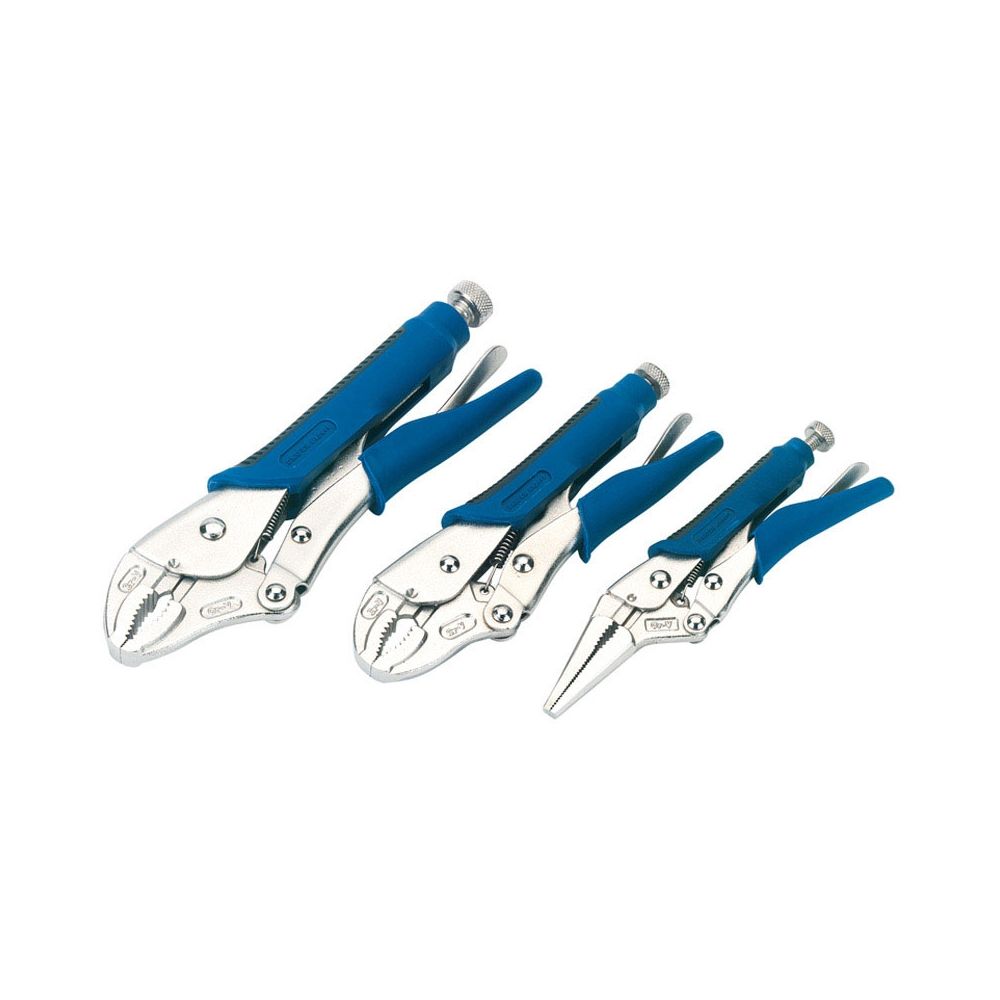- Contenido de 3 tenazas grip con bocas curvas y boca alargada de longitud 165, 185 & 230 mm.