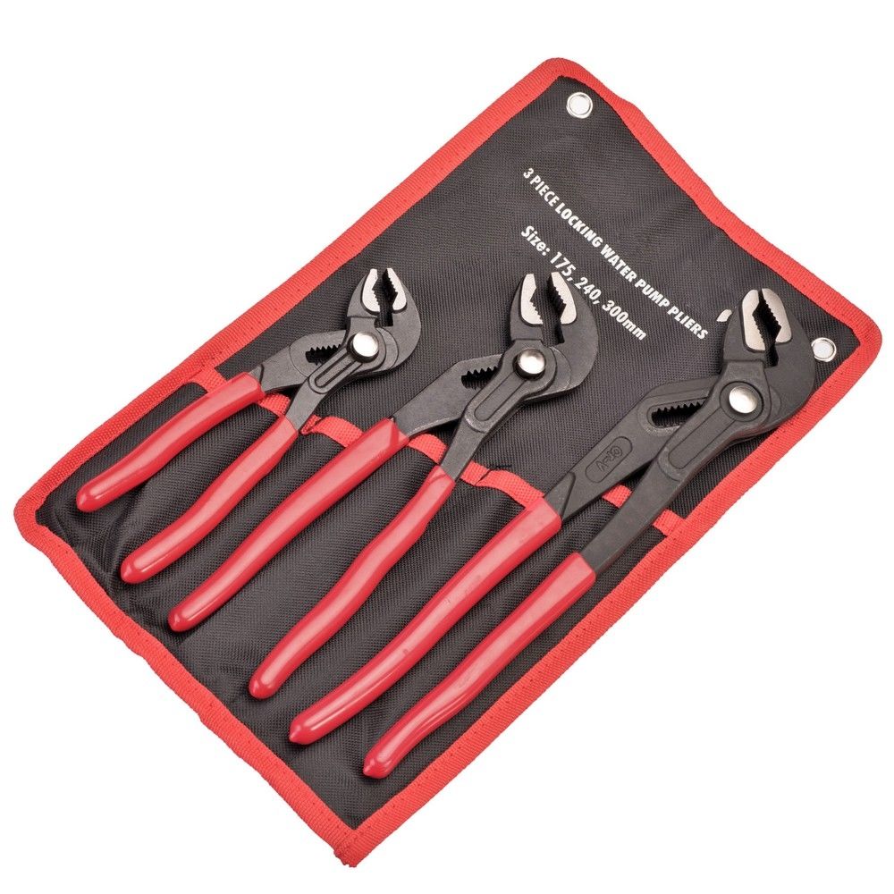 Incluye 3 alicates pico de loro con largo de 175, 240 y 300 mm. y aperturas de boca de 30, 38 y 50 mm.