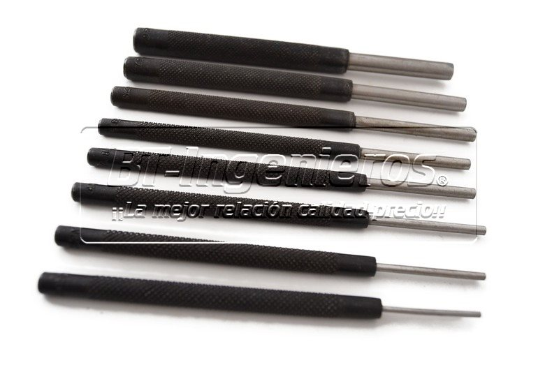 Juego de 8 punzones botadores de 200 mm. Cilindro con corte recto. Fabricados en acero forjado con mangos moletados antideslizantes. Diámetros: 2.4 mm, 3.2 mm, 4 mm, 4.8 mm, 5.6 mm, 6.4 mm, 7.8 mm y 9.5 mm. Producto garantizado.