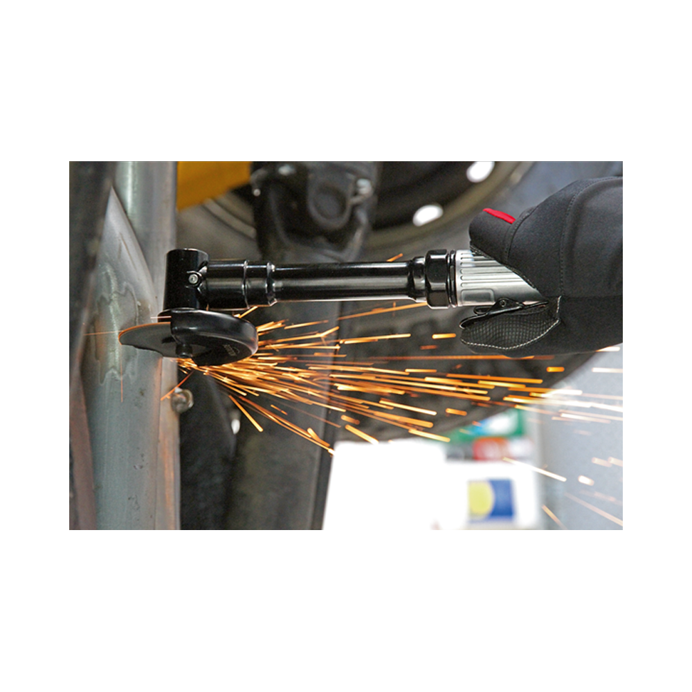 Amoladora radial angular neumática con brazo largo, para discos de 75 mm. Especialmente útil para trabajos de reparación de carrocería en zonas de difícil acceso, corte de tubos de escape, paneles de carrocería, etc.