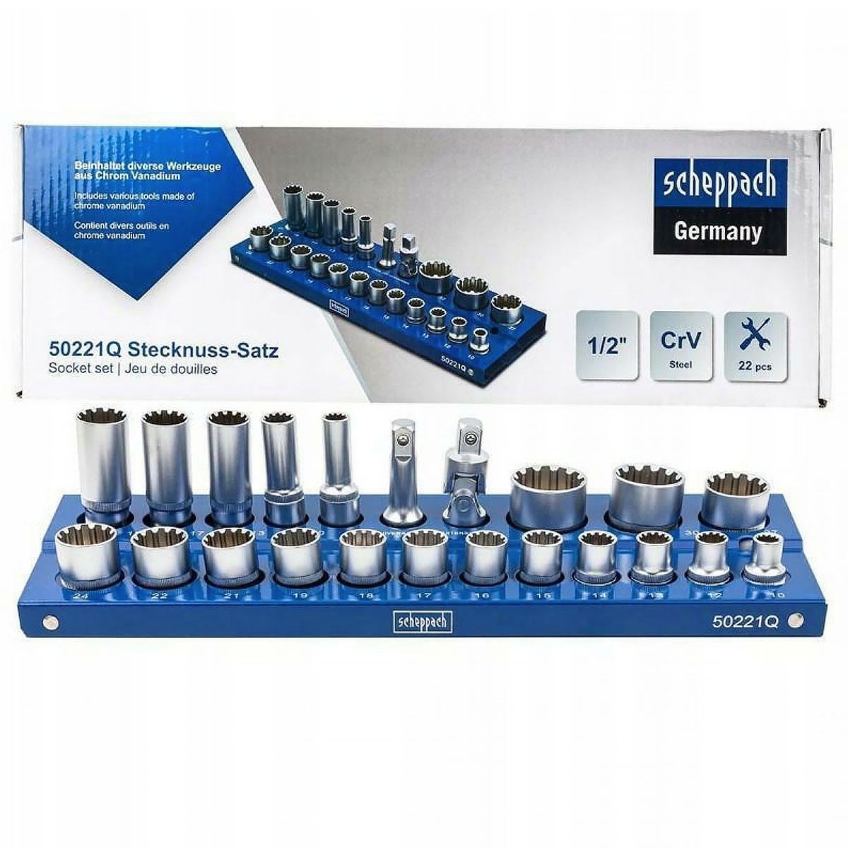 Juego de Vasos Multicara 1/2" Scheppach – 22 Piezas, 10–32 mm, Acero CrV