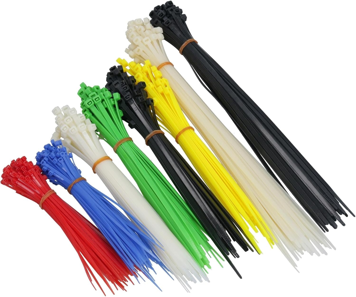 El paquete de 500 bridas para cables contiene diversos tamaños en color blanco, amarillo, azul y rojo. Puede ver el contenido completo detallado más abajo.