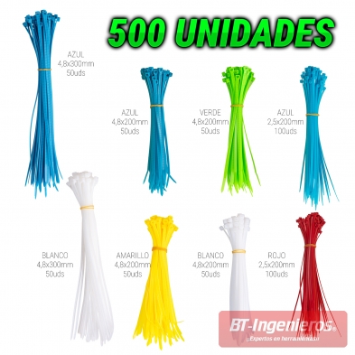 El paquete de 500 bridas para cables contiene diversos tamaños en color blanco, amarillo, azul y rojo. Puede ver el contenido completo detallado más abajo.