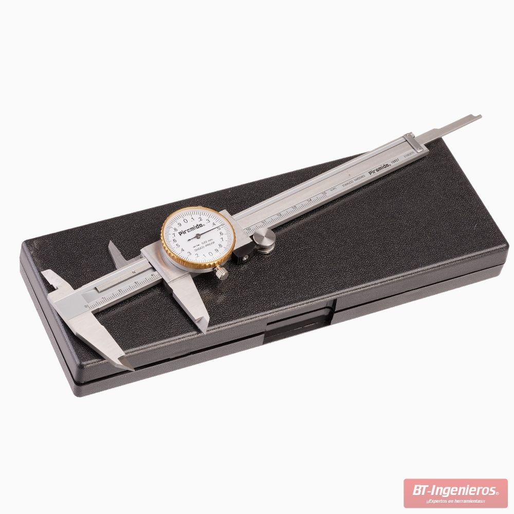 Calibre con reloj de alta precisión Piramide CALR150, para la medición de objetos pequeños e irregulares de 0 a 150 mm. El reloj permite realizar mediciones centesimales.
