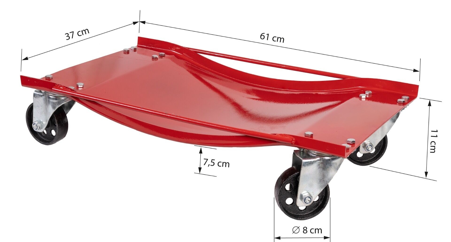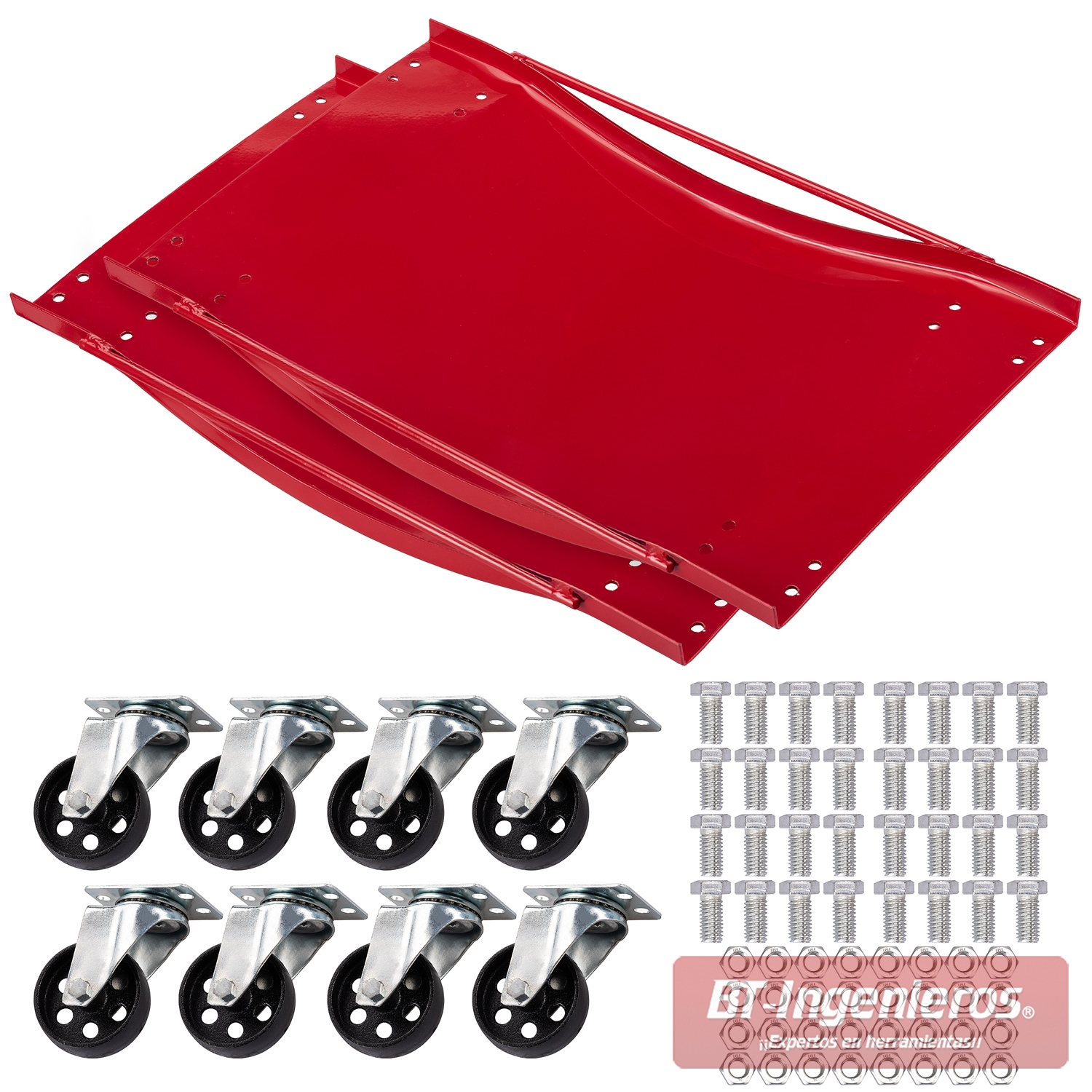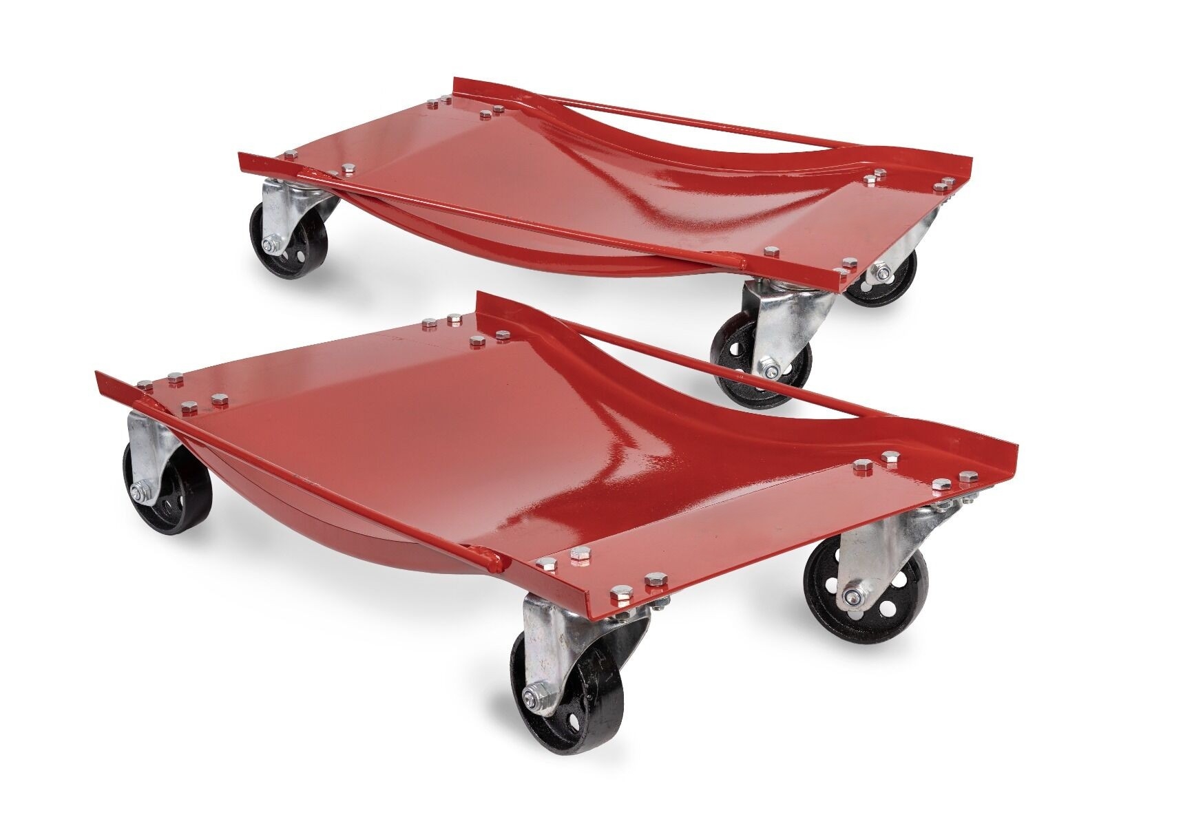 Plataformas rodantes para coche (2 uds) fabricadas en acero de alta resistencia, con capacidad de 900 kg por unidad. Equipados con 4 ruedas giratorias 360º para mover vehículos fácilmente en espacios reducidos, incluso con ruedas bloqueadas.