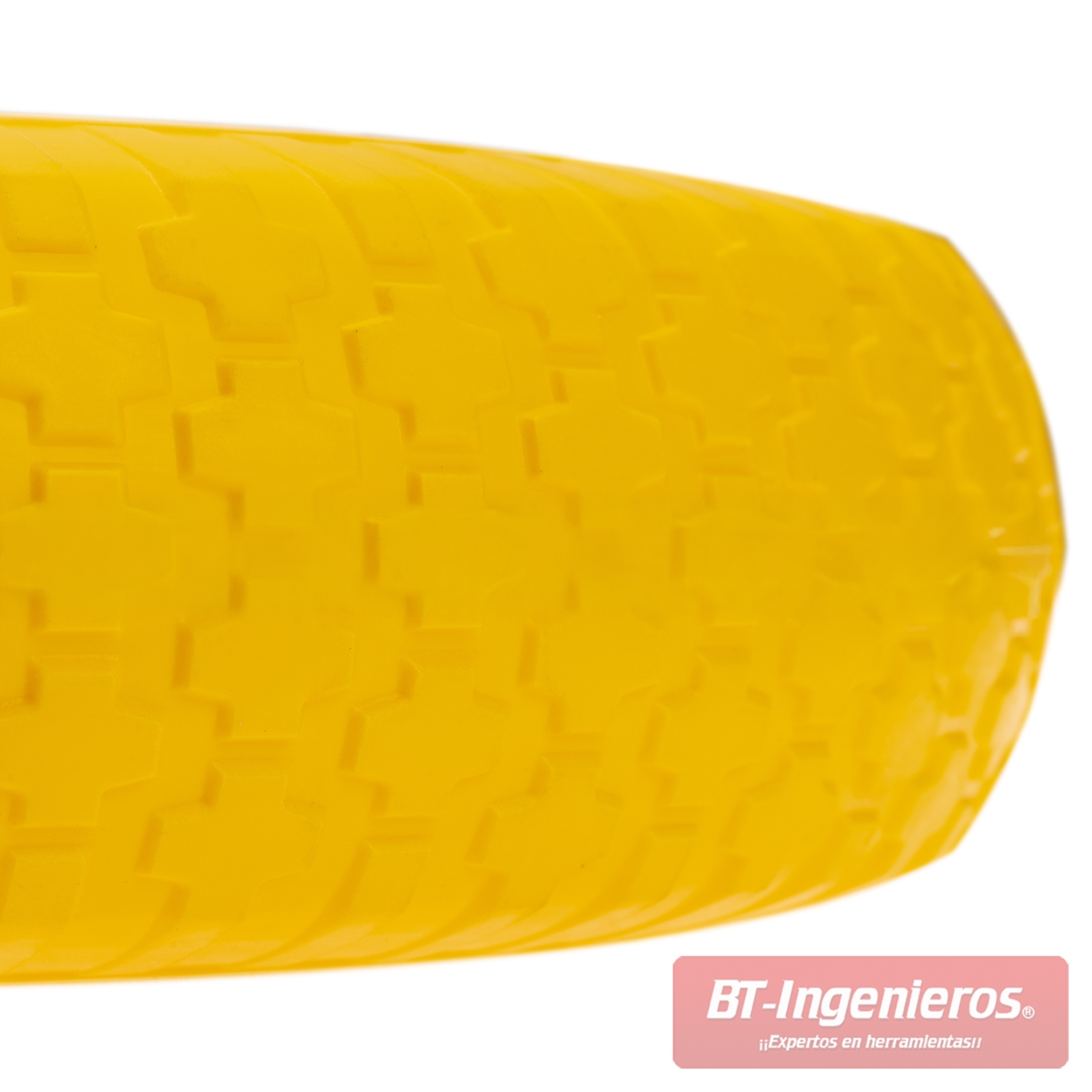 Rueda extra resistente y con una estructura de alta dureza, que no se pincha ni se desinfla, incluso en contacto con materiales cortantes (clavos, cristales, etc), esencial para uso en zonas de obra u otras zonas de trabajo.