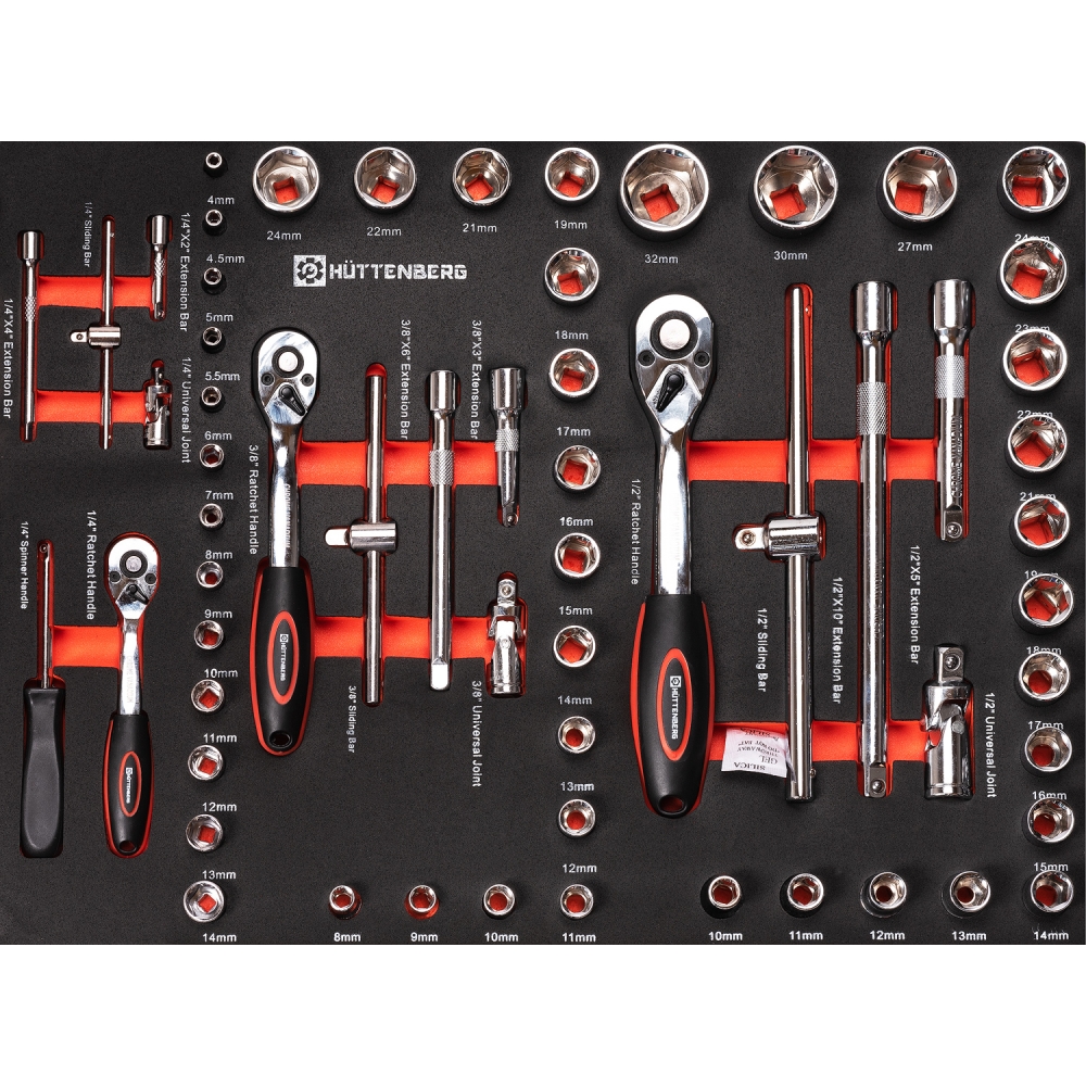 - - Módulo 3: Llaves combinadas con carraca (8 - 22 mm.), llaves allen (1.5 - 8 mm.), vasos largos de 1/4" y puntas planas, torx y estrella.
