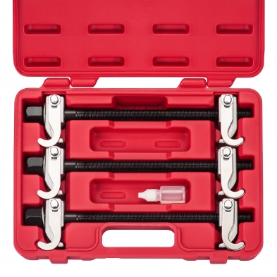 Juego de 3 compresores de muelles de suspensión con sistema de cierre de garras, ajustable al grosor del muelle. Permiten realizar una compresión controlada de muelles helicoidales antes de extraer o reemplazar los amortiguadores.