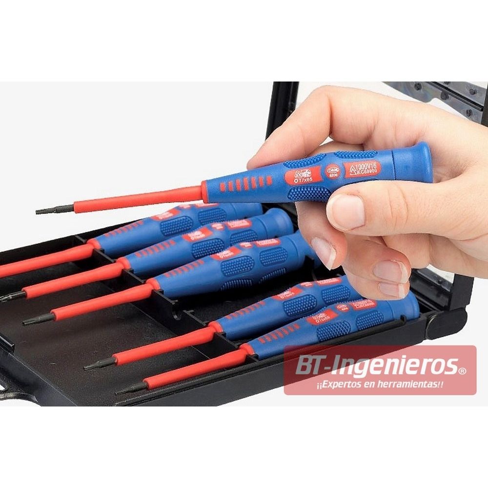 - Juego Expert VDE de destornilladores eléctricos aislados de precisión con cabeza Torx inviolables para aplicaciones de electricidad bajo tensiones de 1000V.