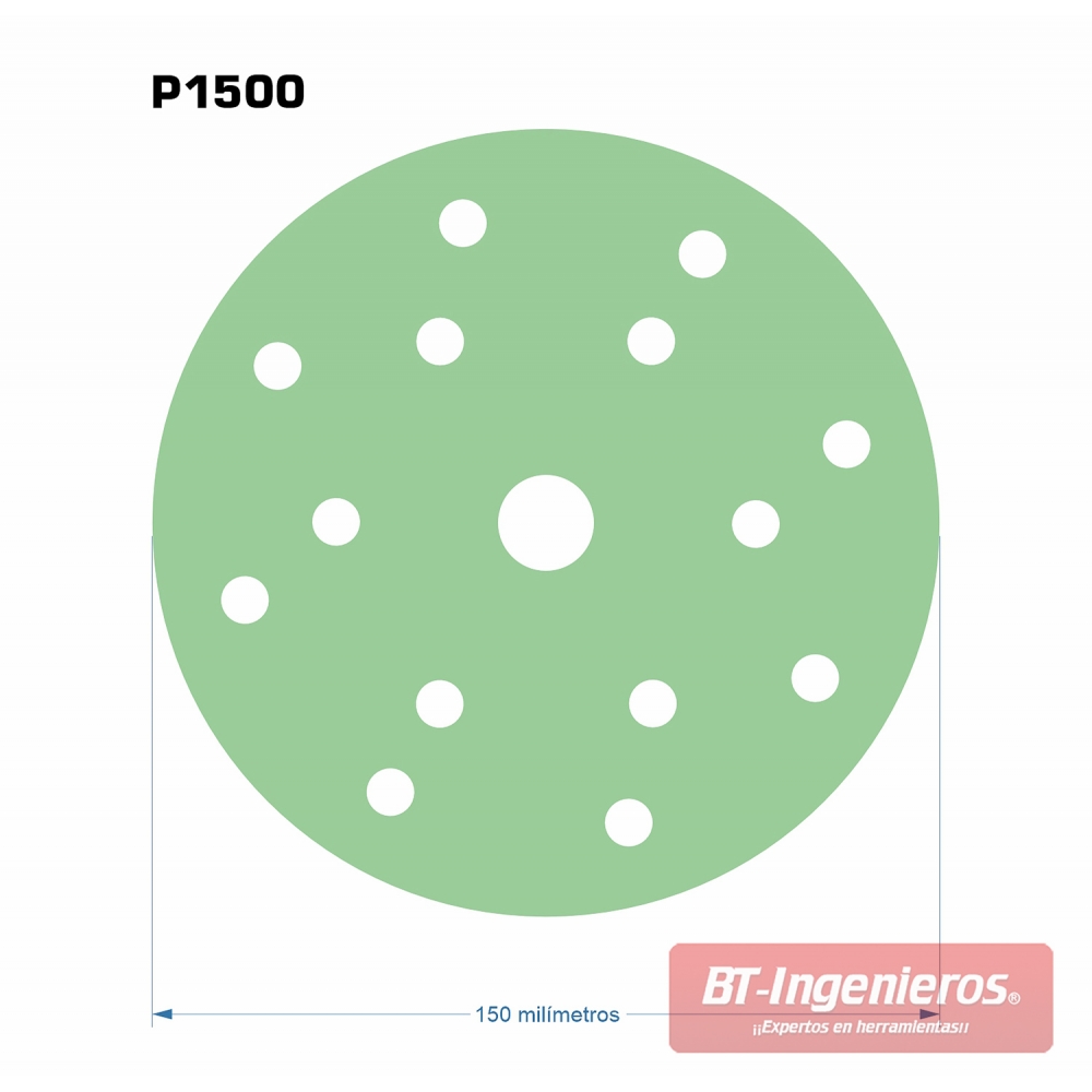 Discos de lijado de óxido de aluminio Ø150 Mm & Grano 1500. Constituidos por respaldo de Film de poliéster, resistentes a desgarros y flexibles, proporcionando una mayor durabilidad en comparación con discos de base de papel.