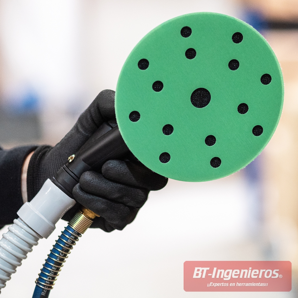- Compatible con lijadoras eléctricas o neumáticas, con soporte Ø150 mm y conexión de velcro.