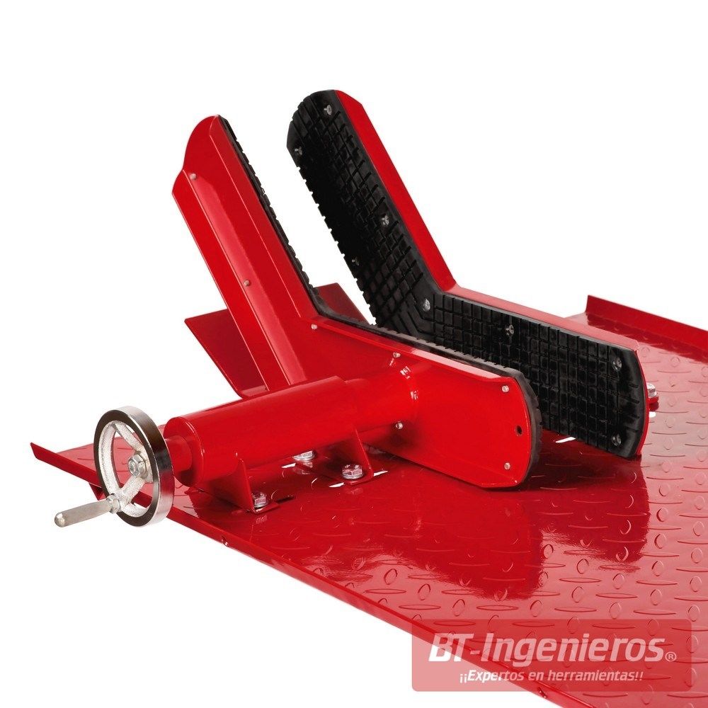 El elevador incluye una rampa de elevación extraíble, que permite subir la moto y se puede dejar instalada o extraer. La base del elevador dispone varios agujeros para sujeción con cuerdas elásticas y una pequeña rampa frontal para parar la rueda en el punto perfecto. Equipado con 2 ruedas fijas y 2 giratorias que permiten moverlos con facilidad en el taller.