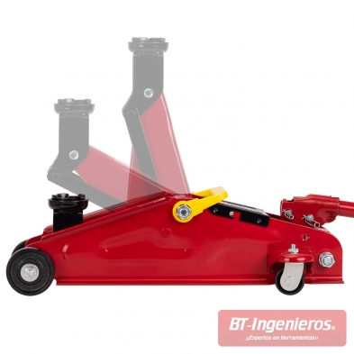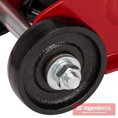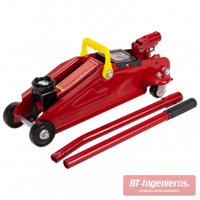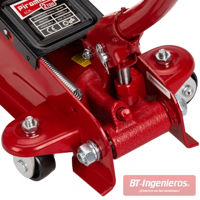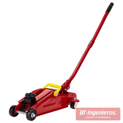 Gato hidráulico de carretilla 2 toneladas fabricado en acero reforzado, ideal para taller y mantenimiento de vehículos. Ofrece una elevación de 140 a 340 mm y cuenta con ruedas de acero, asa de transporte y válvula de seguridad por sobrecarga. Certificación CE/GS/ASME.