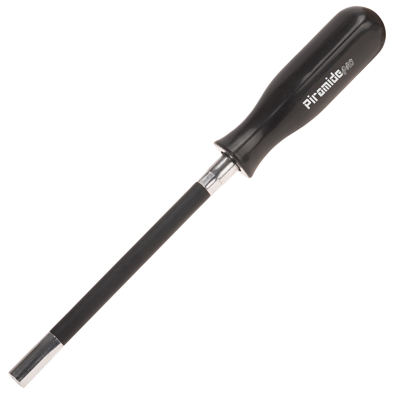 Destornillador flexible de 7 mm Piramide PRO®. Para ajustar abrazaderas y bridas en zonas de difícil acceso, como motores, tuberías o sistemas de climatización. Equipado con mango resistente a impactos y vástago flexible robusto que permite aplicar fuerza sin deformarse.