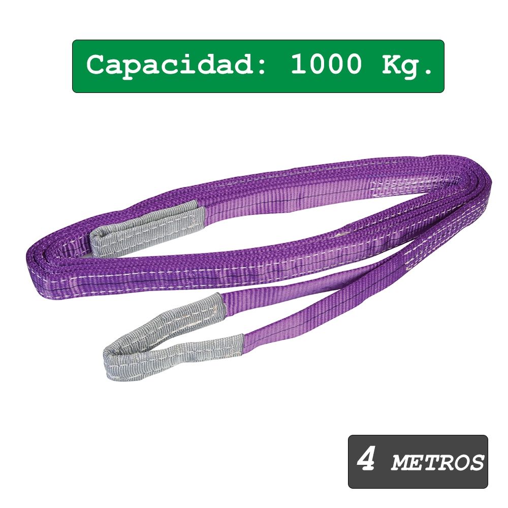 Eslinga con capacidad de 1 Tonelada y longitud de 4 metros. Sujeta, eleva o tira de cargas de forma segura. Fabricada 100% en Poliester PES de alta tenacidad.