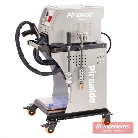 Equipo equipado con pistola Spotter que permite extraer abolladuras mediante la técnica de soldadura por puntos de forma sencilla con solo accionar el gatillo. Equipado con dos martillos de inercia y múltiples accesorios, incluido carro de transporte con ruedas.