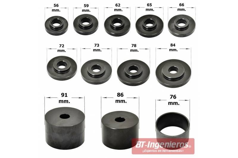 Incluye 11 discos para empujar rodamientos con diámetros de 55 hasta 91 mm.