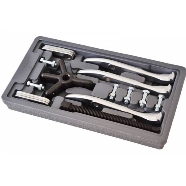 Este kit ofrece un conjunto universal de extractor de rodamientos, poleas, engranajes... Incluye puente para 2 y 3 garras, garras reversibles y con dos posiciones de altura y una apertura máxima de 150 mm. por lo que será útil para los rodamientos más grandes.