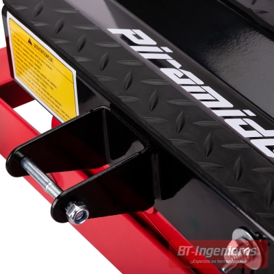El gato de foso hidráulico GF500K con una capacidad de 500 Kg. porta una robusta estructura de acero diseñada para facilitar la movilidad y elevación de cargas. Equipa un potente sistema hidráulico que alcanza una altura de 2 metros. El pistón dispone de accionamiento mediante pedal, lo que libera las manos; y un mango que otorga un control total sobre el descenso, dotando a este gato de foso de una gran precisión para situar la carga en el punto deseado en cada momento