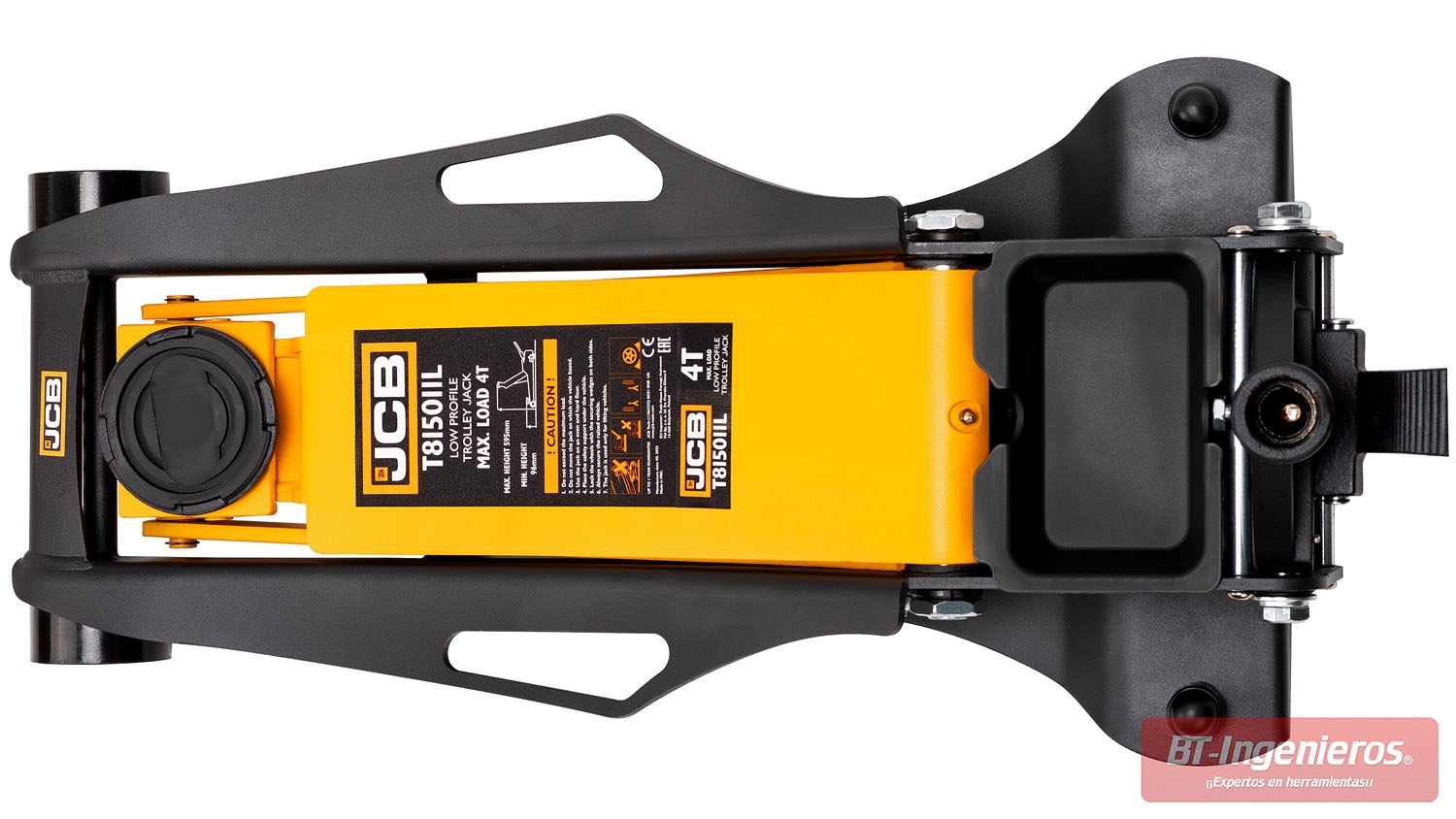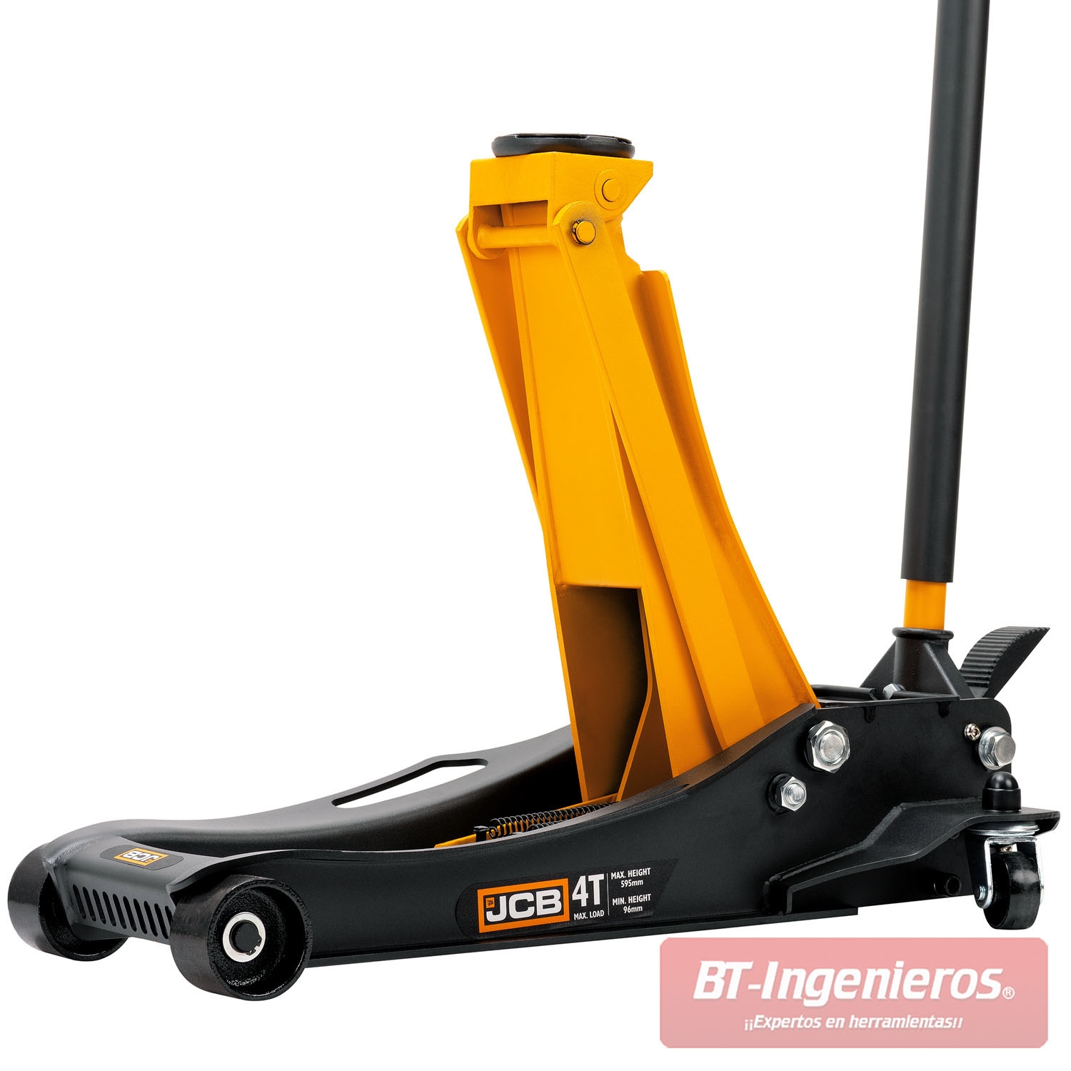 Gato hidráulico de carretilla 4 toneladas JCB con perfil bajo de 96 mm y elevación máxima de 595 mm. Equipado con doble pistón para subida rápida, pedal trasero de aproximación y chasis reforzado para uso intensivo en taller.