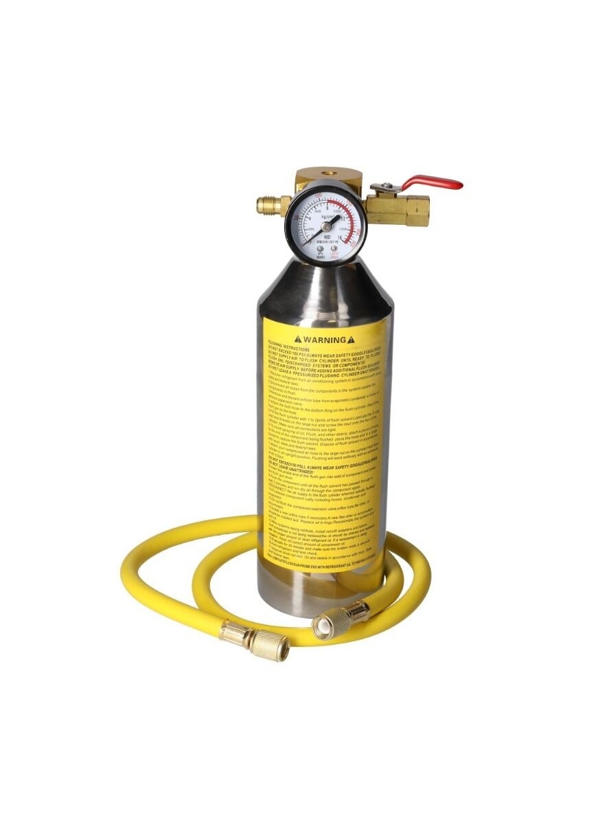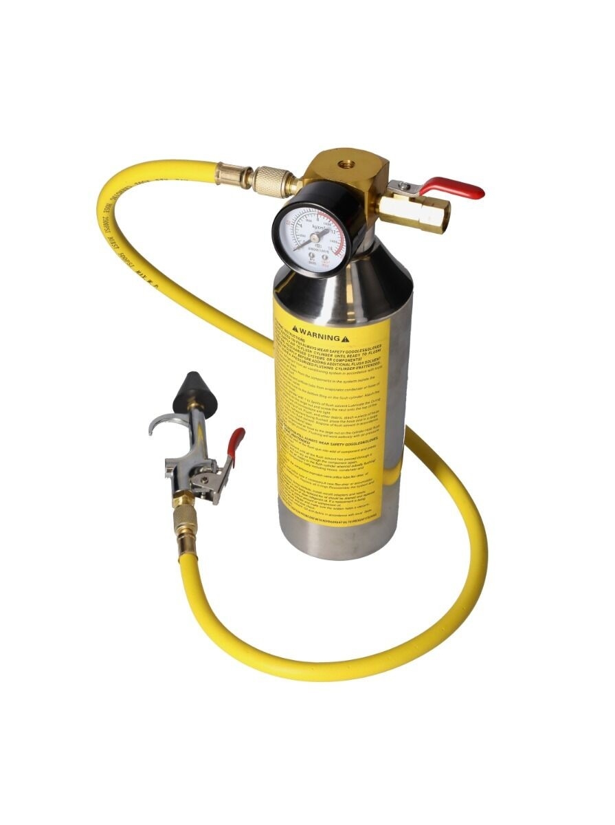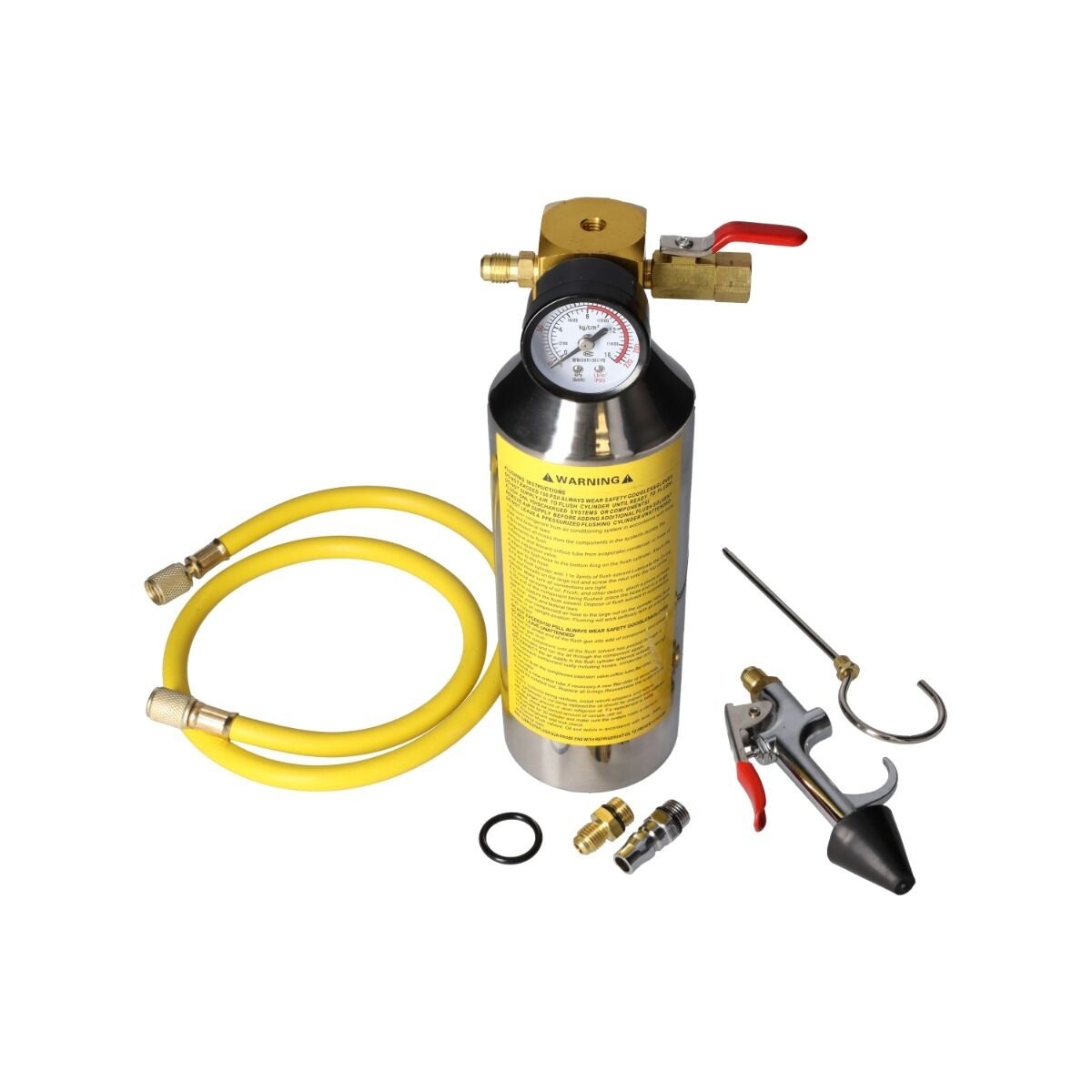 Kit de limpieza para aire acondicionado (A/C Flush) con botella de acero inoxidable, manómetro, válvula de alivio y pistola con punta cónica. Permite la limpieza de líneas de aire acondicionado, condensadores y evaporadores tras gripado del compresor o reparaciones, también compatibles con sistemas de aire acondicionado del hogar y refrigeradores. Compatible con sistemas R134a, R12, R22, R410a, R404a y otros refrigerantes.