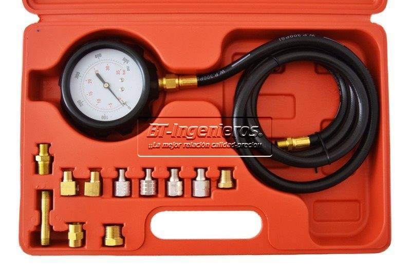 Comprobador de presion de aceite con manometro. Este kit permite realizar la comprobación de la presión de aceite en motores de vehículos, camiones, maquinaria, etc. que funcionen con aceite.