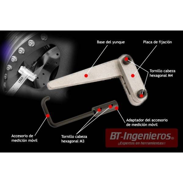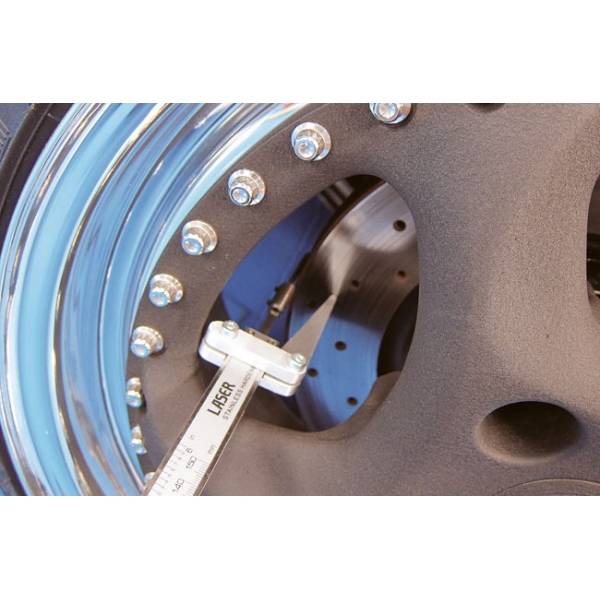 Adaptador muy útil que ofrece una medición precisa del grosor del disco y permite ahorrar tiempo al hacerlo sin necesidad de desmontar las ruedas. A través de la parte delantera de las llantas con huecos o por la parte trasera de la rueda.