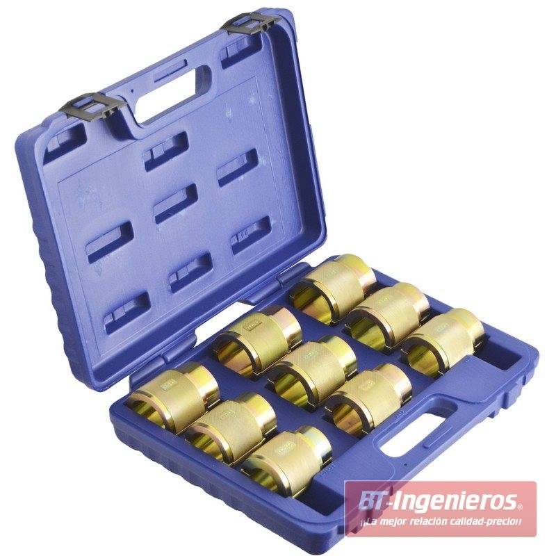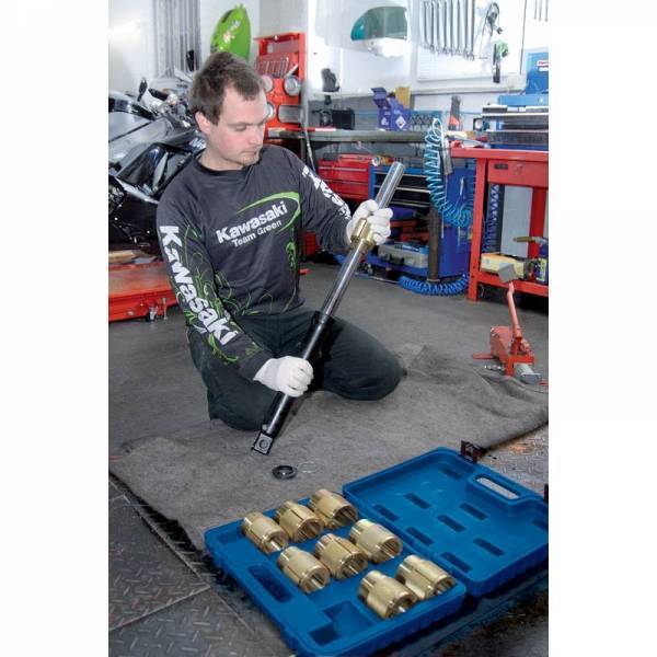 Extractor compuesto por 9 instaladores con medidas de 35 a 54 mm. En un solo maletín dispone de un servicio para cualquier medida de horquillas convencionales o invertidas.