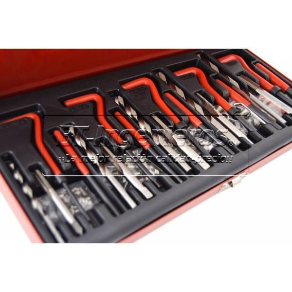 El set es perfecto para restaurar roscas dañadas en acero, fundición, hierro y aluminio. Con este kit, puede realizar fácilmente reparaciones de motor y otras aplicaciones automotrices, salvando piezas valiosas y reduciendo costos.