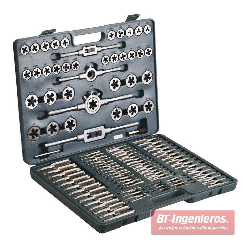 Maletín de herramientas para roscar o filetear con 110 piezas. Cubren las métricas de M2 a M18.