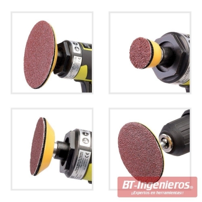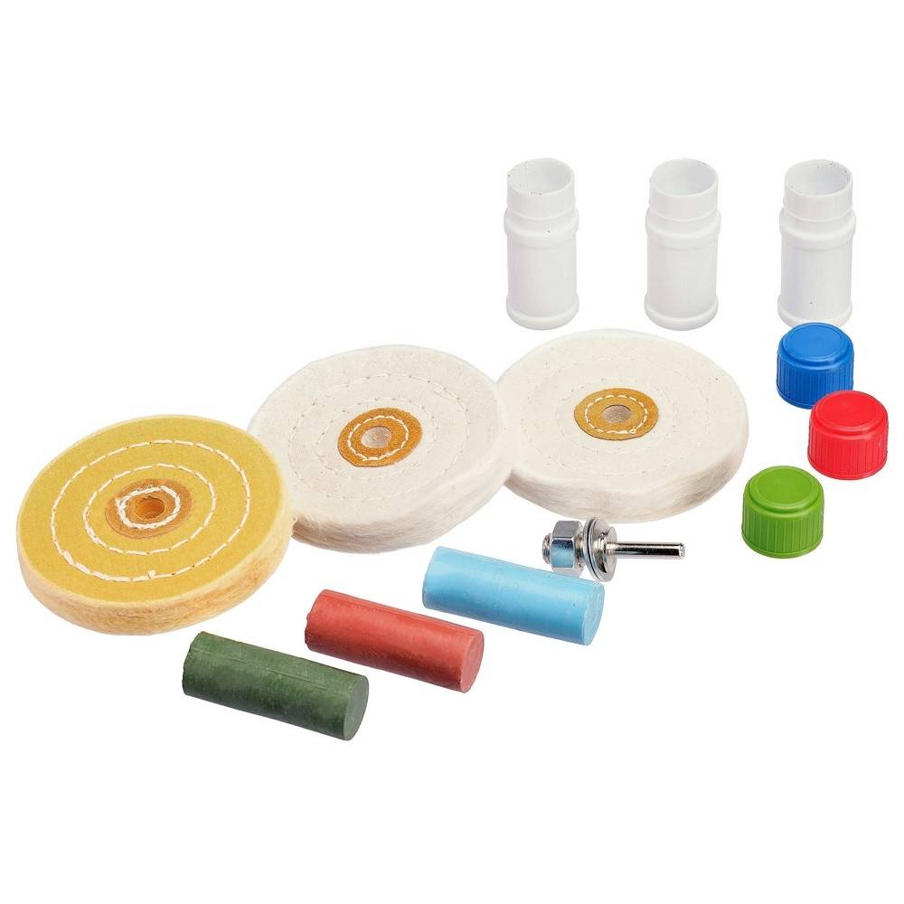 Kit de discos de pulir y pastas abrasivas para limpieza, pulido y abrillantado de metales, aceros o plásticos. Utilización con taladro eléctrico, taladro neumático o amoladoras mediante vástago de 1/4” (6,35 mm.).