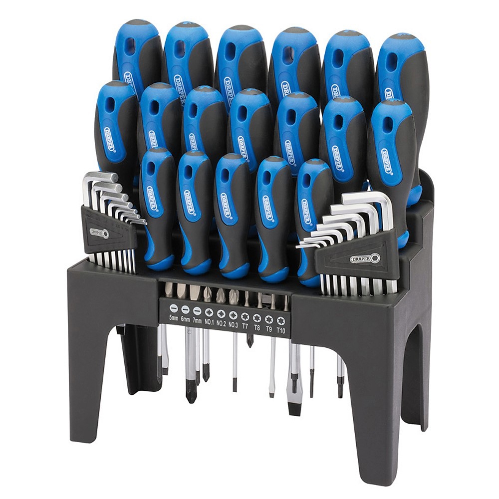 - Juego de 44 piezas Draper de destornilladores, llaves allen y puntas de atornillado, organizadas en soporte de almacenaje para mantener las herramientas siempre ordenadas y a mano en el banco o mesa de trabajo.