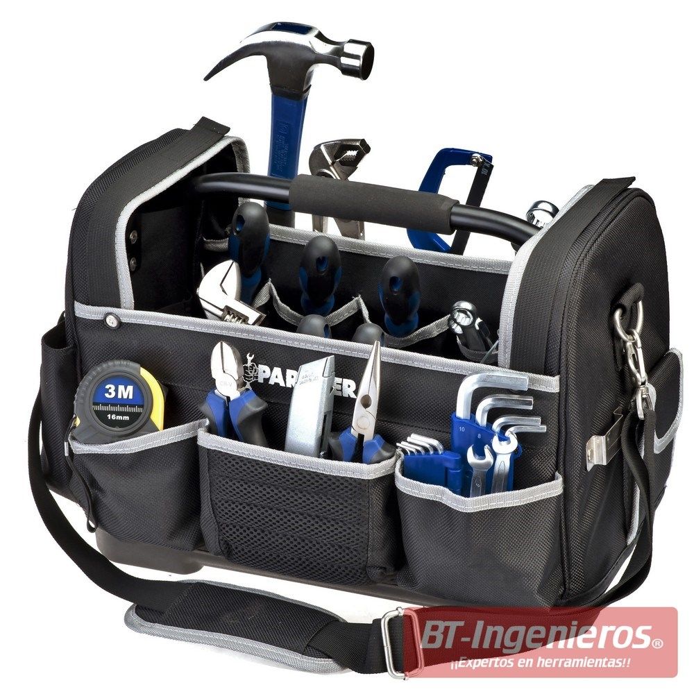 La bolsa de transporte con estructura rígida, permite transportar las herramientas incluidas y otras piezas, consumibles o herramientas necesarias para el trabajo. Su estructura, con fondo y paredes sólidas y asa de transporte están diseñados para soportar el peso y golpes durante el tiempo. La asa incluye un acolchado que mejora el agarre. 11 compartimentos externos, 7 compartimentos internos y 17 alojamientos elásticos para destornilladores y llaves fijas.