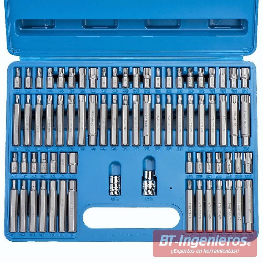 Excelente maletín de llaves para taller con las puntas de atornillado tipo Torx, Hexagonales, XZN, Ribe (Torx PLUS) y Torx de seguridad (con agujero). 74 piezas en total, con una fabricación íntegra en acero Cromo Vanadio de tipo 6150, con acabado pulido.