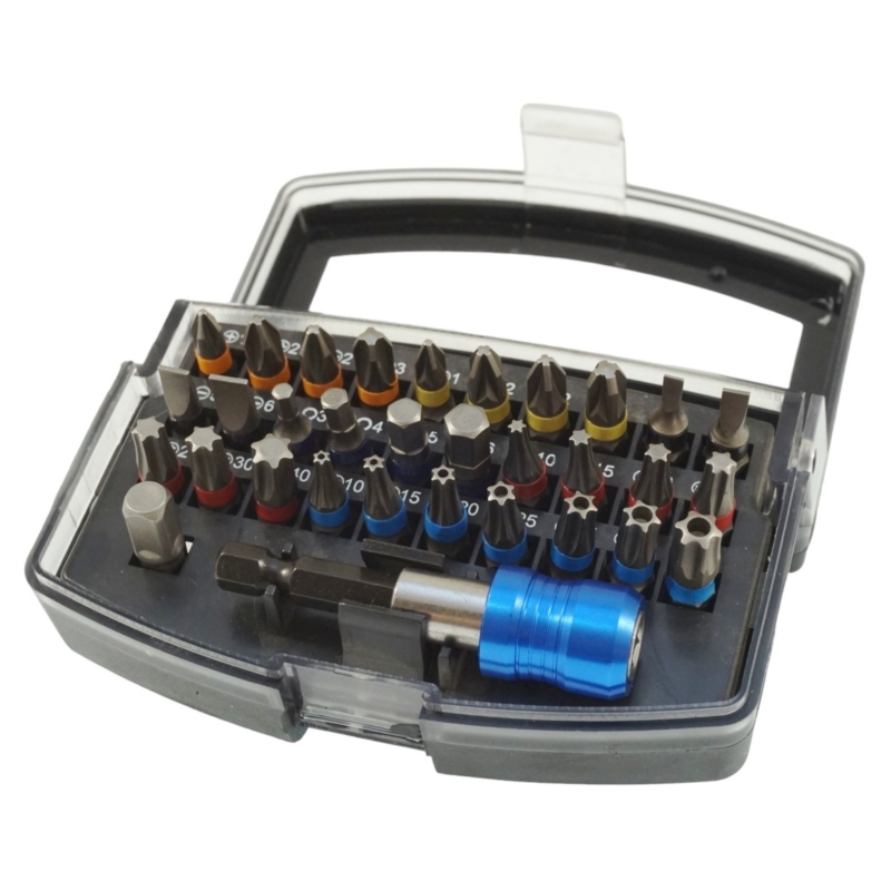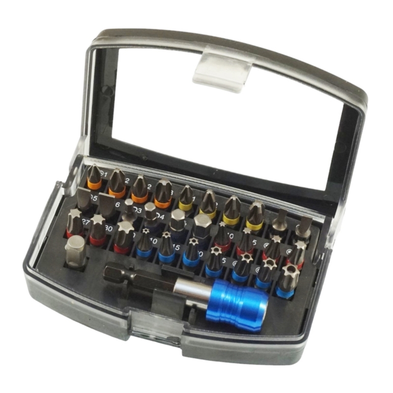 Juego con adaptador para atornillador con portapuntas de 1/4" & 30 puntas bit con las medidas más utilizadas pozidrive, phillips, planas, hexagonales, Torx y Torx de seguridad.