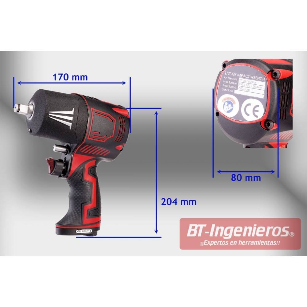 Llave diseñada para uso profesional en un taller de automoción. El par de apriete de 1288 Nm, unos 130 Kg con embrague de doble martillo, permite trabajar incluso con llaves de 3/4" para reparación de camiones, maquinaria, etc.