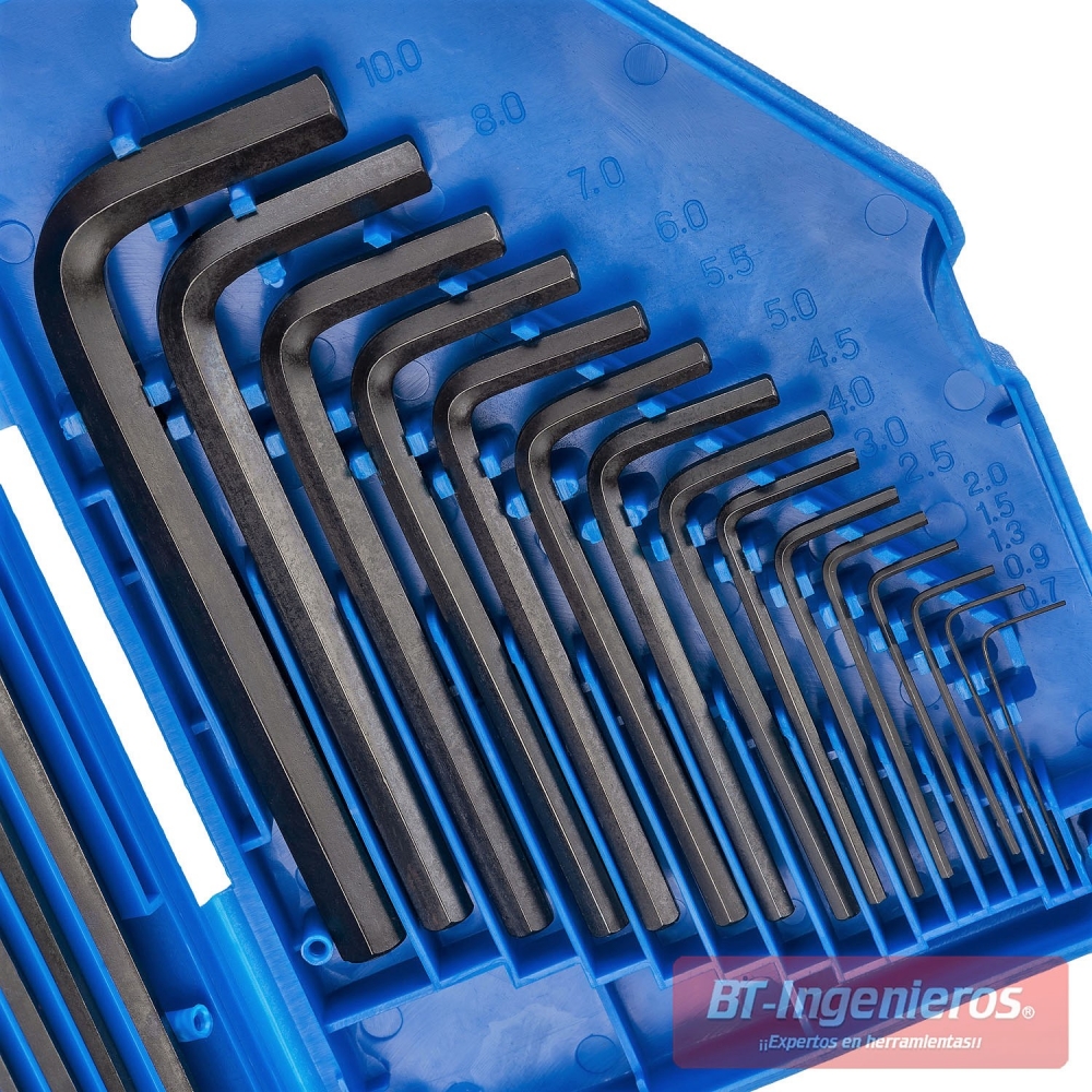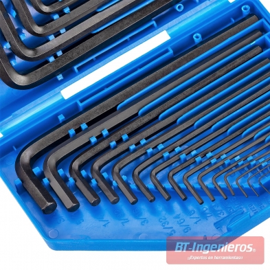 Juego de llaves allen hexagonales equipado con las medidas más utilizadas en métrica y en pulgada.