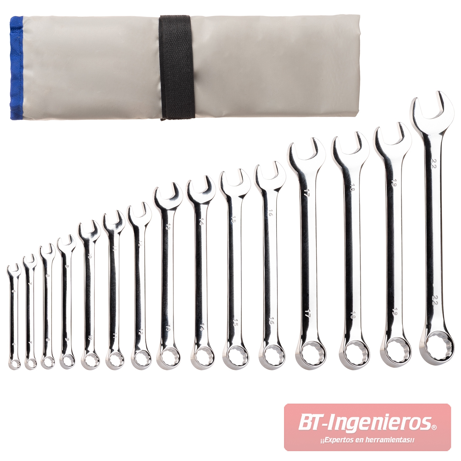 Este juego de llaves combinadas 6–22 mm incluye un práctico estuche organizador que facilita el transporte y mantiene todas las herramientas perfectamente ordenadas.