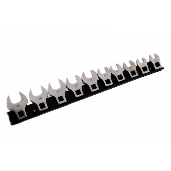 Juego de 10 Llaves Planas con soporte para carraca de 3/8". Fabricadas en acero cromo vanadio, forjado y pulido. Perfectas para trabajar en espacios reducidos. Calidad garantizada.