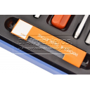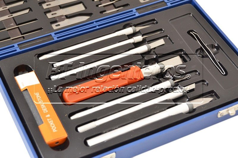 El kit también contiene una piedra para afilado suave, que te permitirá mantener tus cuchillas en óptimas condiciones, y una pinza de precisión para tareas de alta precisión. Todo ello viene en una resistente caja de almacenaje, perfecta para mantener tus herramientas organizadas y protegidas.