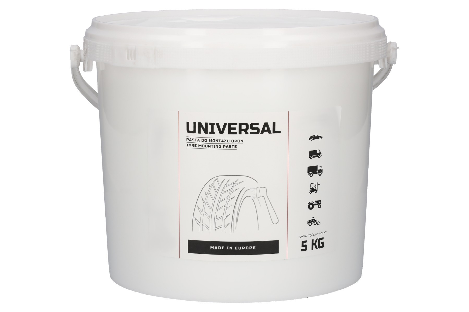 Pasta de montaje de neumáticos UNIVERSAL en cubo de 5 Kg, color blanco y de consistencia densa. Ofrece un alto poder lubricante para facilitar el montaje y desmontaje de todo tipo de neumáticos (turismos, SUV, furgoneta). Es químicamente neutra con caucho y metal, seca de forma transparente y no ataca la llanta.