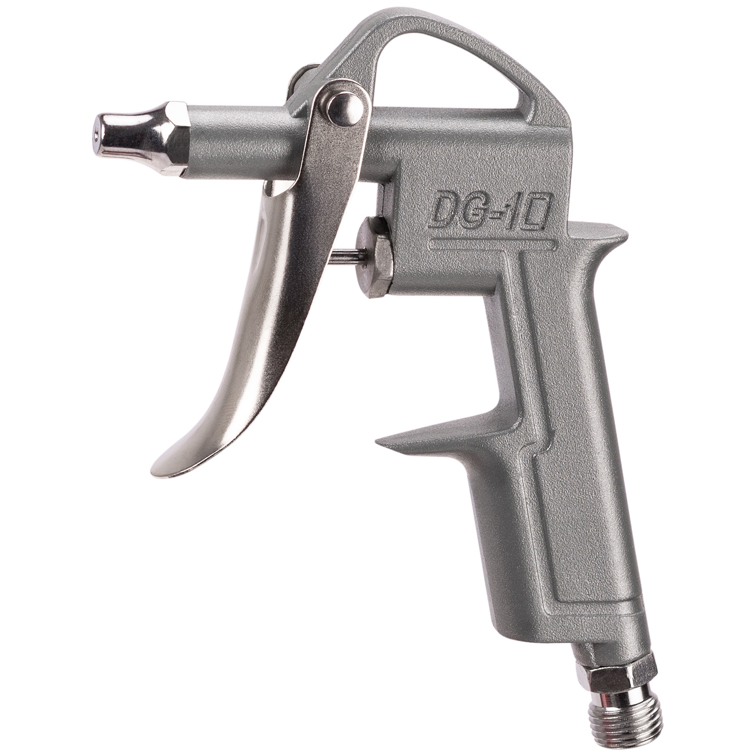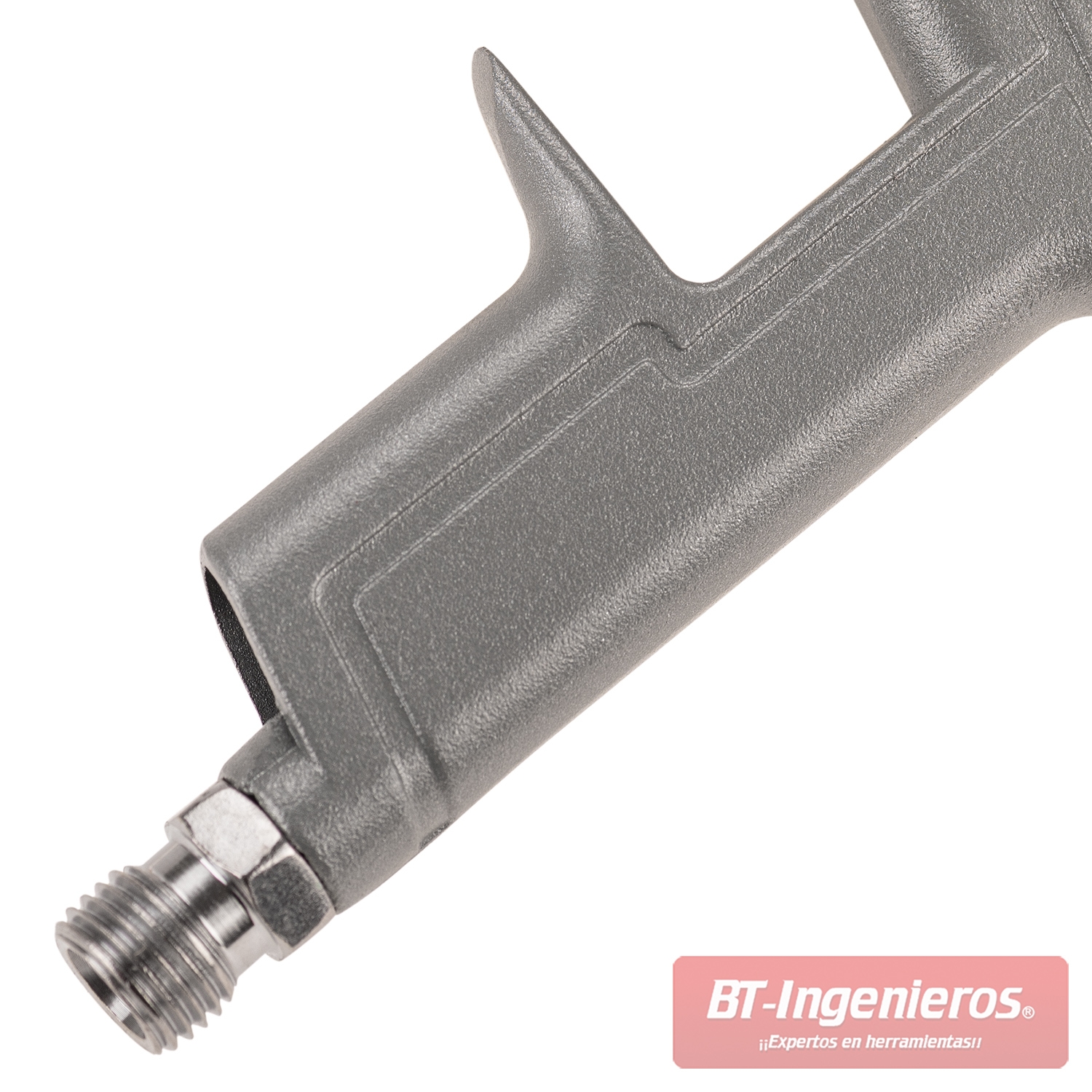 Pistola sopladora de aire comprimido con boquilla corta, ideal para limpieza rápida y secado de piezas y herramientas. Construida en aluminio ligero, con gatillo grande de control progresivo y conexión 1/4" BSP. Perfecta para uso profesional en taller.