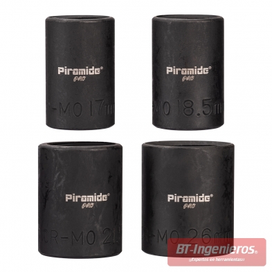 Juego de 4 extractores de tornillos antirrobo o tuercas dañadas Piramide PRO® diseñados para la extracción eficiente de tuercas redondeadas o tuercas de seguridad de ruedas. Fabricados en acero molibdeno endurecido y químicamente ennegrecido para resistencia a la corrosión. El kit incluye tamaños para curbri las medidas más comunes que van desde 17, 18.5, 21.5 hasta 26 mm. y viene en una caja metálica.