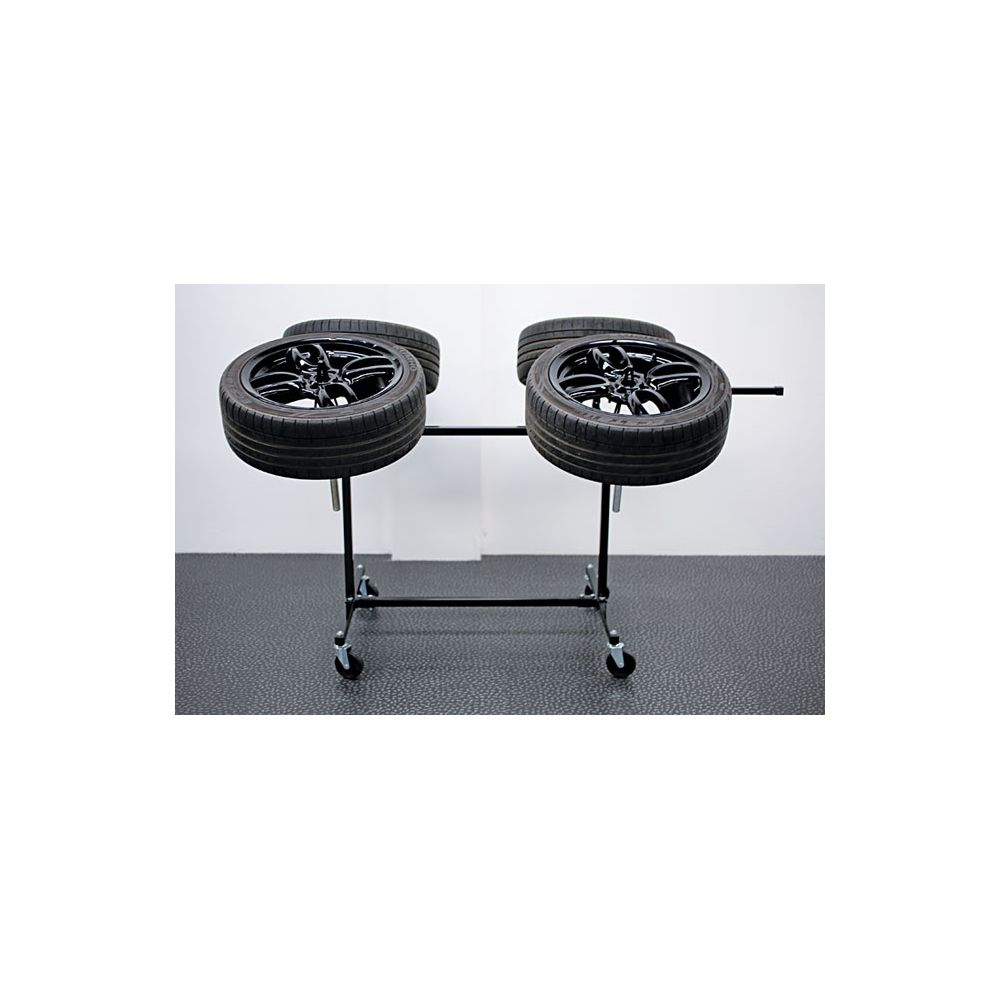 Soporte de llantas para trabajos de reparación de llantas en taller y pintar llantas en cabinas de pintura. Equipado por 4 bases rotatorias y ajustables en altura para llantas de hasta 22” y estructura robusta móvil con cuatro ruedas de nylon.