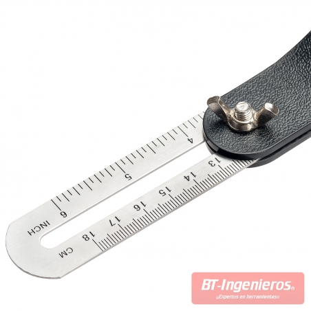 Constituida por hoja de acero inoxidable con medidas graduadas por ambas caras de 0 a 18 cm, tuerca mariposa para bloqueo / desbloqueo de la escuadra, mango de plástico resistente a impactos.
