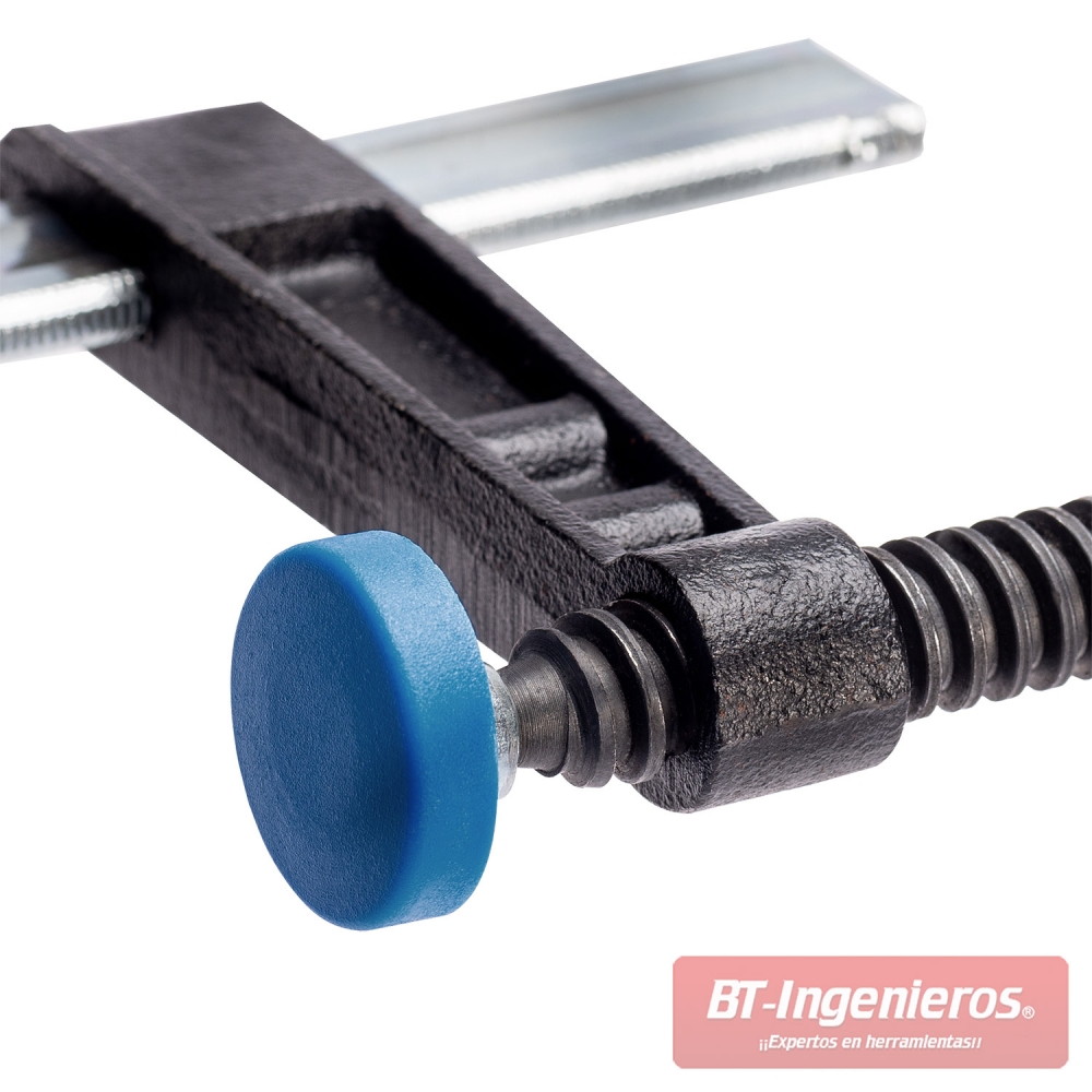 Constituido por guía de deslizamiento con mecanismo dentado antiretroceso, mordazas con tapas de protección de plástico para no marcar las piezas de trabajo, mordaza móvil con cabezal rotatorio y mango engomado antideslizante.