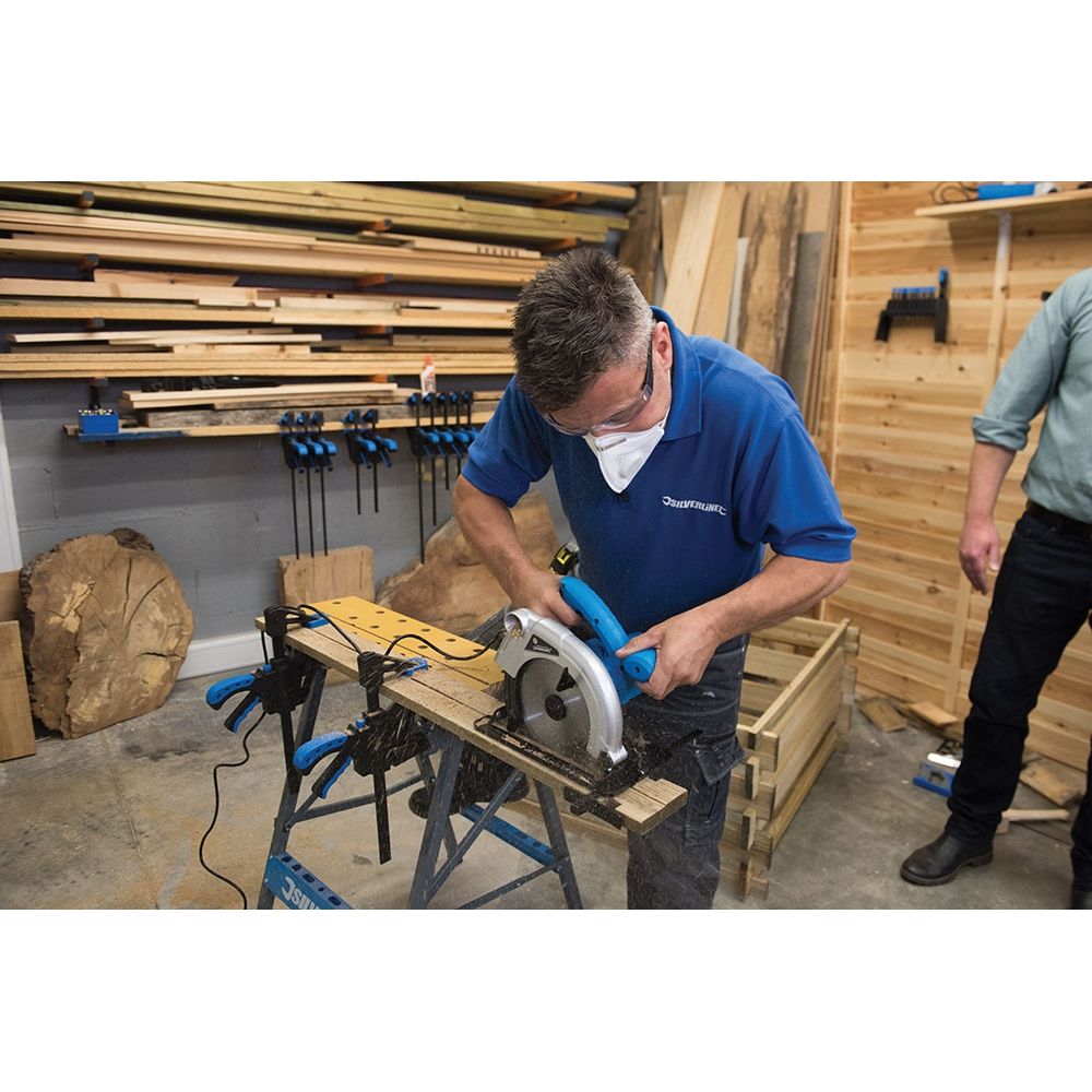 Sierra circular con motor de 1200W & guías de corte de profundidad y ángulo regulables, para realización de cortes biselados de 0 - 45º y profundidad de corte de 0- 50 mm, efectuando cortes rápidos, escuadrados y precisos en maderas duras y blandas, madera maciza, tableros, perfiles de madera, ensamblajes, etc.