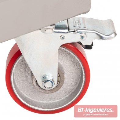 - Ruedas industriales: 4 unidades con rodamientos y freno, 125 mm diámetro