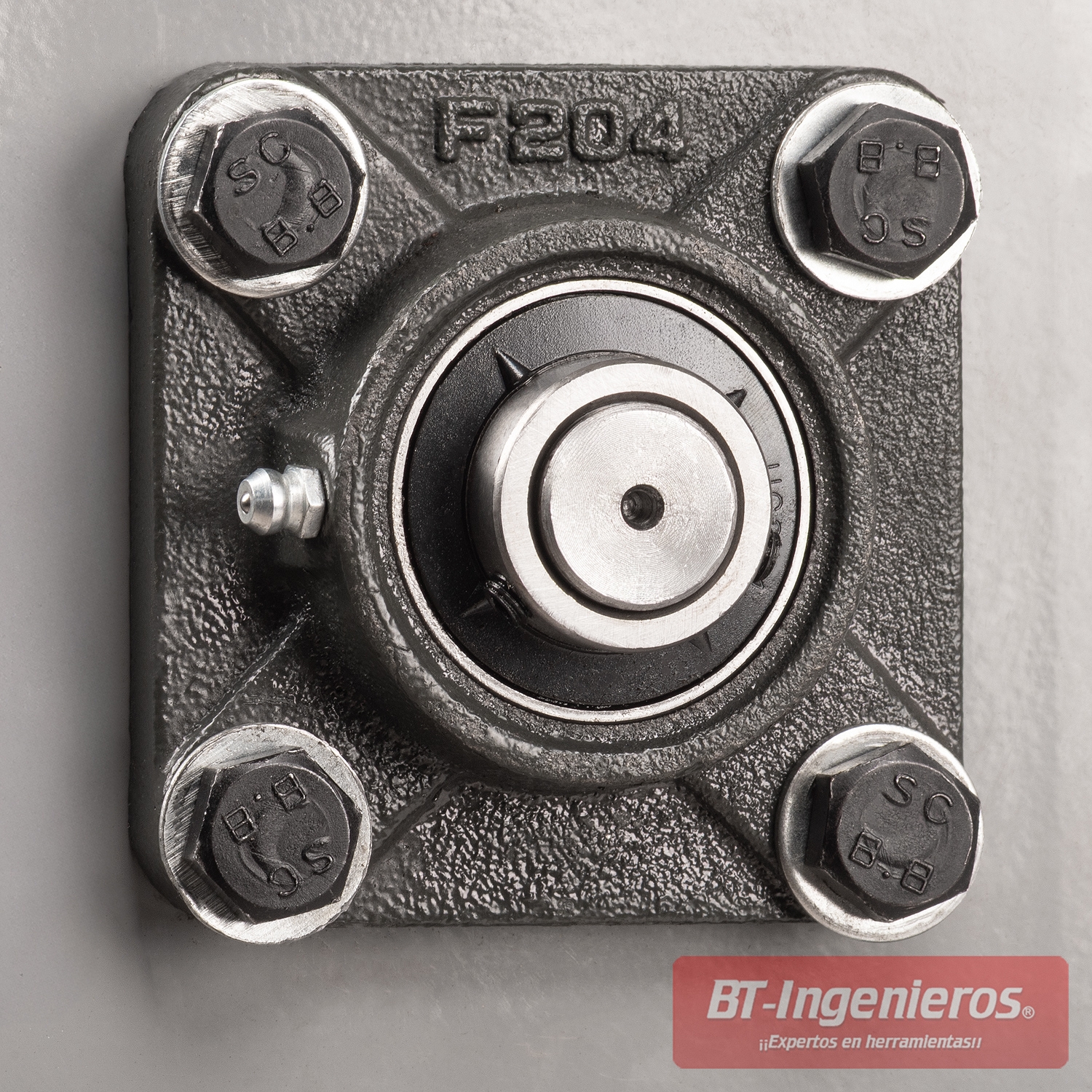 - Rodamientos industriales: Tipo chumacera F204 para giro suave y sin holguras